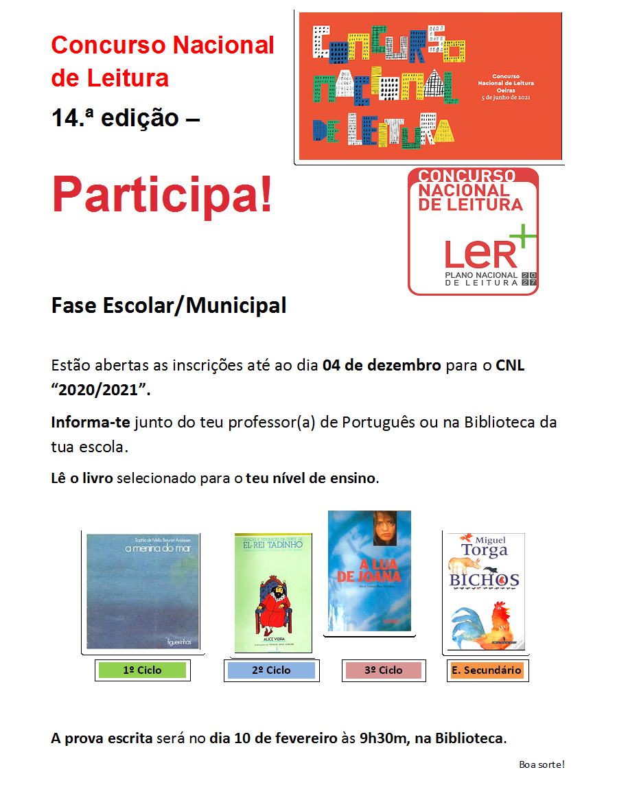 Está a decorrer a inscrição da fase Escolar/Municipal do Concurso Nacional de Leitura. Se estás interessado em participar, não percas tempo. Vai à biblioteca manifestar interesse e requisita o livro.