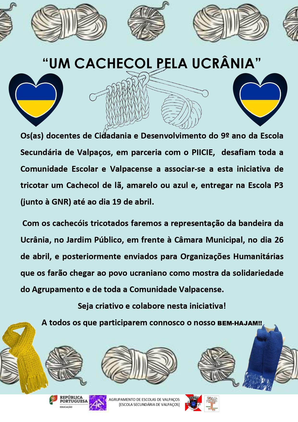 Os docentes da disciplina de Cidadania e Desenvolvimento do 9º ano juntamente com o PIICIE (Plano Integrado e Inovador de Combate ao Insucesso Escolar) uniram-se em prol do povo da Ucrânia e convida a todas as Associações, comunidade escolar e do Concelho de Valpaços a colaborar connosco.